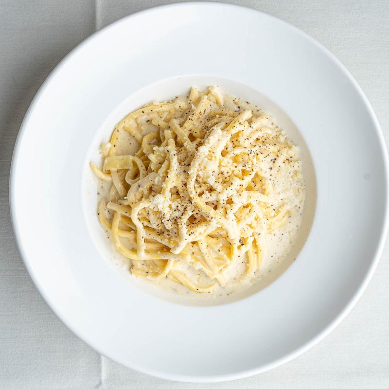 Homemade pasta served with a parmigiano-reggiano and black truffle fondue, with shaved black truffle.